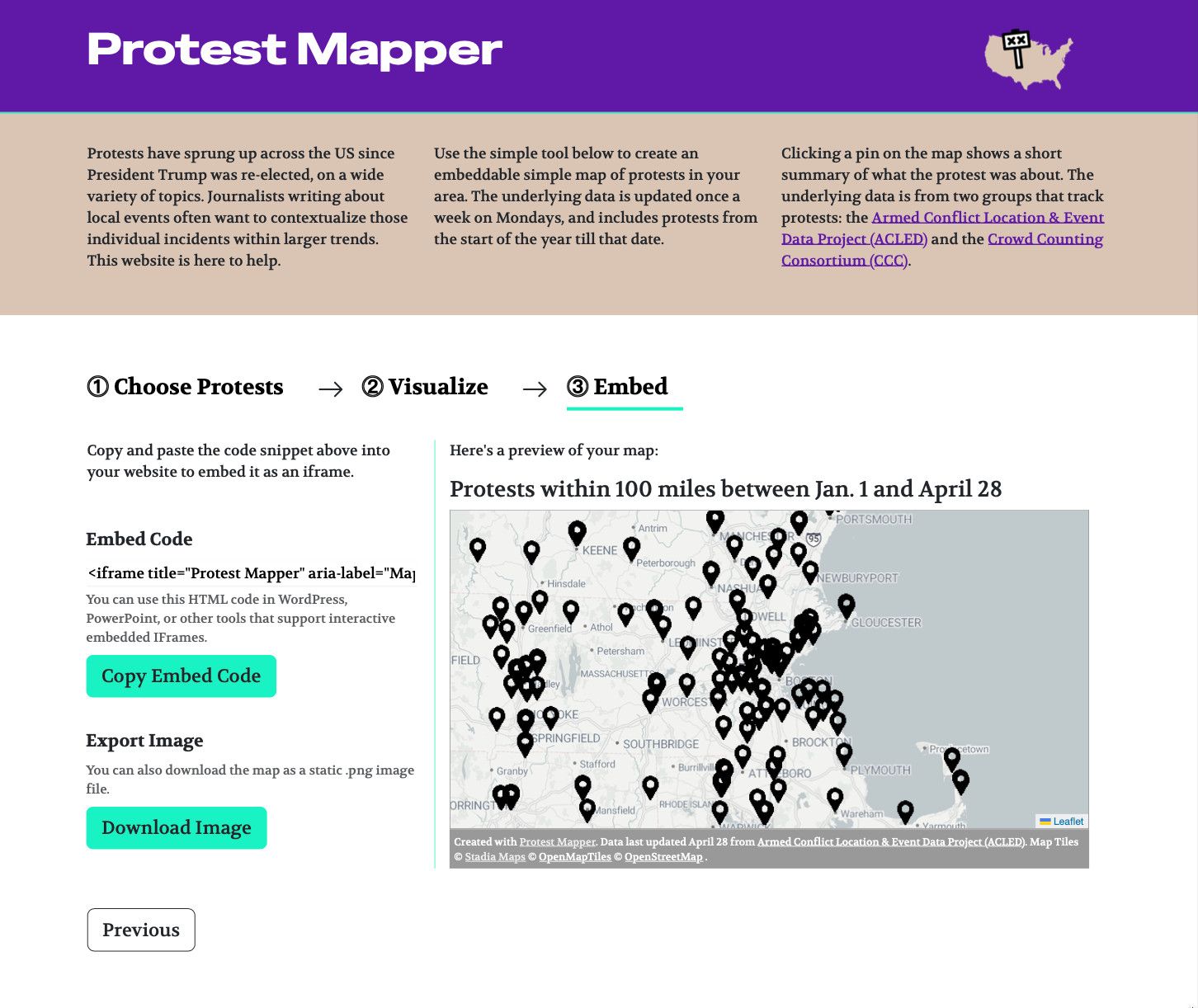 Journalists can struggle to connect individual events to larger movements. I built Protest Mapper to help by letting you embed interactive maps or images of local protests into your stories. Pick a timeframe, a locaton, and tweak the map. I keep the data up to date via verified reports from ACLED or CCC. I strongly belive there is a place for these kinds of small pieces of public interest technology, so Iβll keep building them.